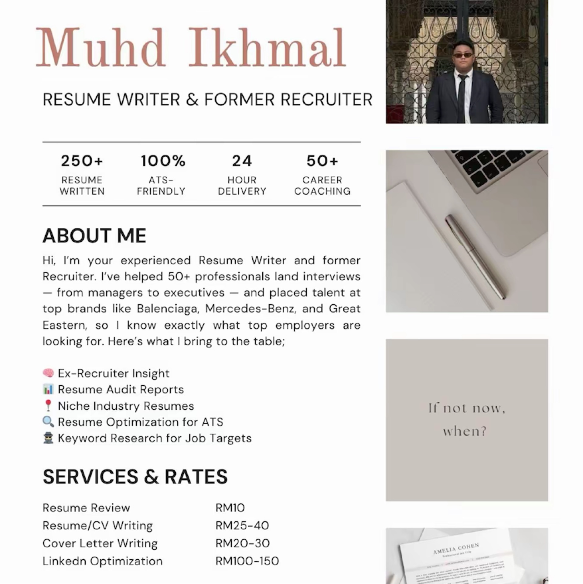 ATS-Friendly Resume Services ✔ Resume review – from RM10 ✔ New resume creation – RM25–RM40 (based on experience level) ✔ Keyword-optimized for ATS ✔ Clean layout, easy to scan by recruiters